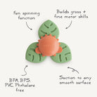 Featuring a playful design and soothing colors, our dino suction spinner toy will captivate your little one’s imagination. Littles can spin the 100% food-grade silicone leaves around the dinosaur to create a delightful visual and soothing sensory experience. The sturdy suction ensures the spinner stays in place, preventing accidental drops and encouraging independent play. Keep baby’s attention at home or on-the-go by suctioning to highchairs, cabinet doors, airplane trays, or the bathtub.