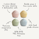 Add a pinch of sweetness to playtime with our mix and match silicone cupcakes. Made in four delicious shades, littles can practice color matching or get creative and cook up their own combinations. The sprinkled frosting top and squeezable silicone base easily separate and reattach to help develop fine motor skills and hand-eye coordination. With small draining holes on the bottom for easy cleaning, these cupcakes are a charming addition to play kitchens, tea time, or bath time.