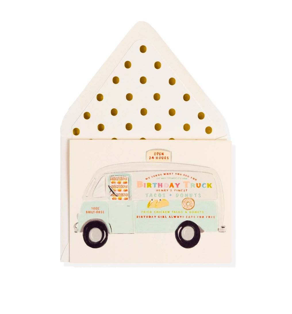 It's Your Birthday Truck Our sweet illustration delivery truck serves what they ask for. Eat what you want and birthday girls eat for free! Fried chicken tacos and donuts!