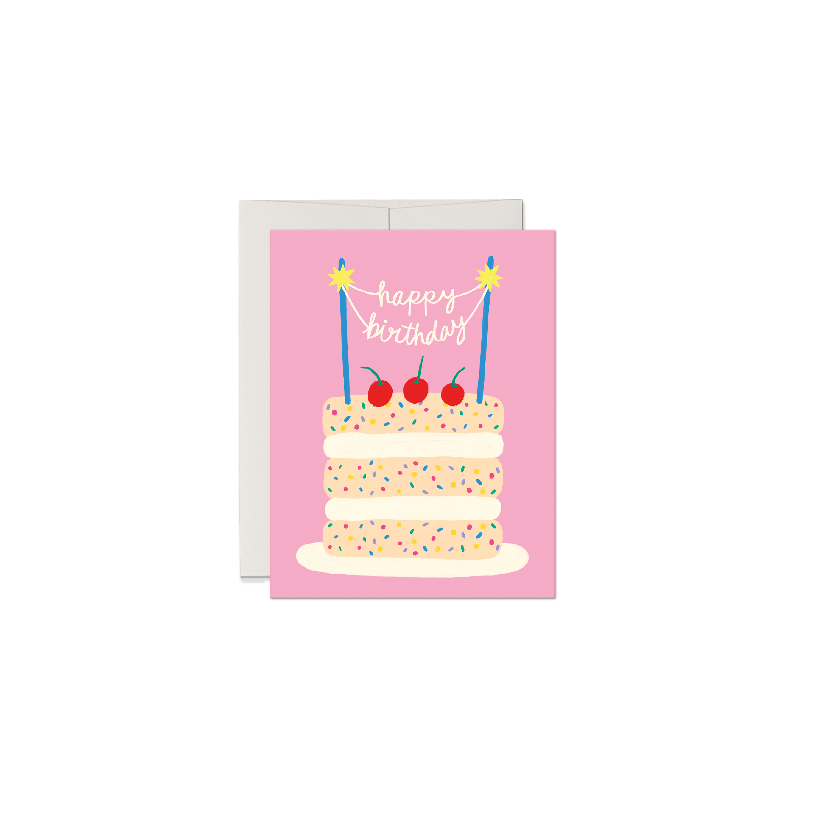 A festive birthday card featuring a sprinkle-covered layer cake topped with cherries and sparklers. Perfect for celebrating in a sweet and cheerful way.