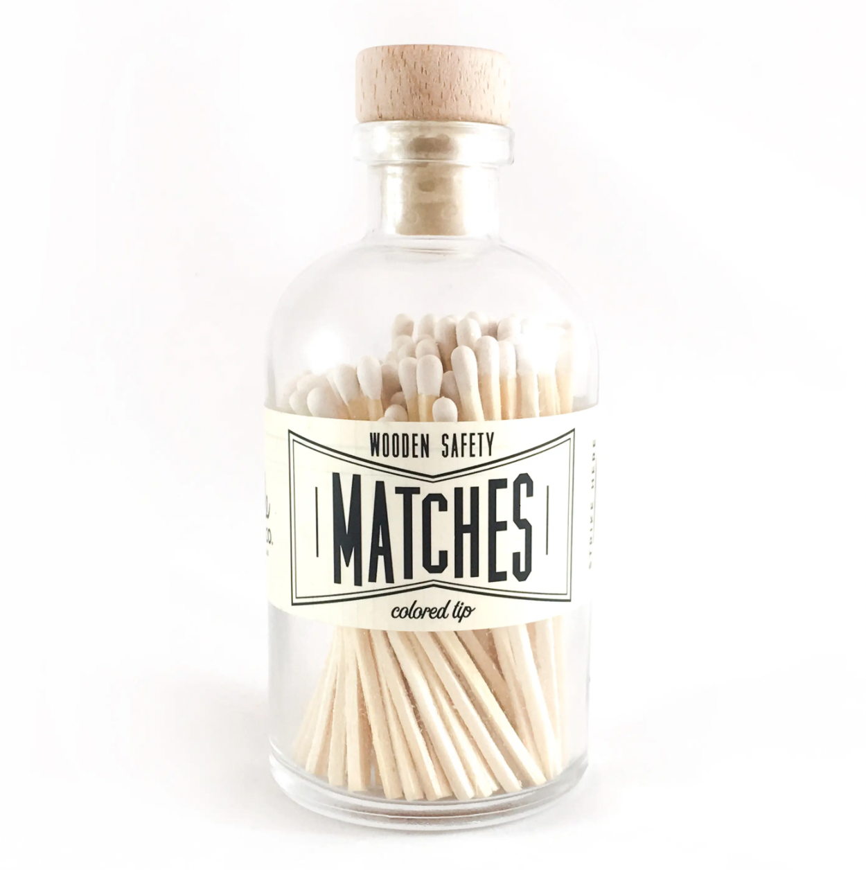 Add charm and functionality to your home with our vintage apothecary collection. Vintage labels, playful colors and a functional striker all seamlessly curated for you to enjoy. Each bottle is handcrafted with the upmost care and attention to detail by our family. • 5 1/2" HIGH x 2 1/2" WIDE JAR • 100 MATCHSTICKS AT 3 1/2" TALL • WOODEN CORK TOP WITH LOGO • VINTAGE STYLE LABEL WITH STRIKER