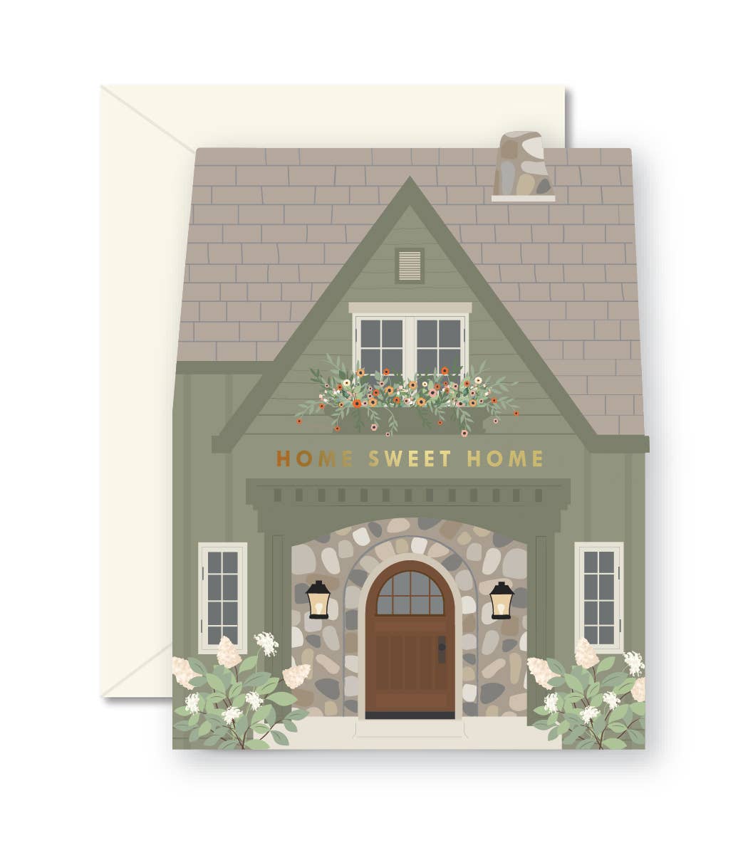 A sweet new die-cut home folded greeting card and coordinating envelope to congratulate new homeowners!