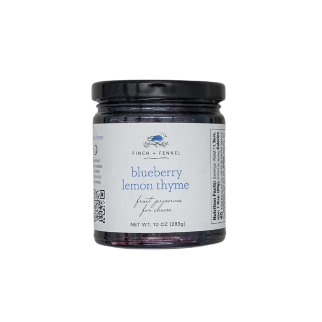 Blueberry Lemon Thyme Fruit Preserves for Cheese. Perfectly pair this fruit preserve with hard cheeses like Manchego, Tomme, Gouda, or Comte on your next charcuterie board.