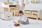 Ideal for any child's bedroom or playroom with 4 handmade wicker baskets that can be removed for tidy up time! Made from plywood, this storage unit is sturdy enough to double up as a bench seat and with its neutral tones and running rabbit feature fits very well as part of our forest furniture range.