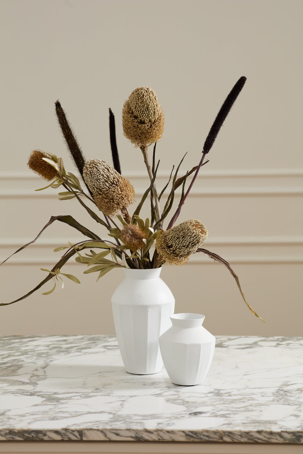 With its classic shape & modern sheet metal material, the Dulcet Vase stands out as a lightweight, versatile statement piece for wedding & event design or everyday florals. Featuring a tapered neck, fluted design, & slightly textured tan matte finish, this vase adds a neutral touch to any occasion while allowing lush, colorful florals to make a statement.