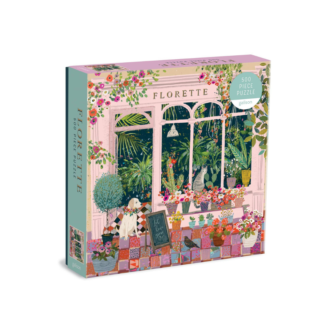The Florette 500 Piece Puzzle features a charming illustration of an inviting plant shop by bestselling artist Victoria Ball.