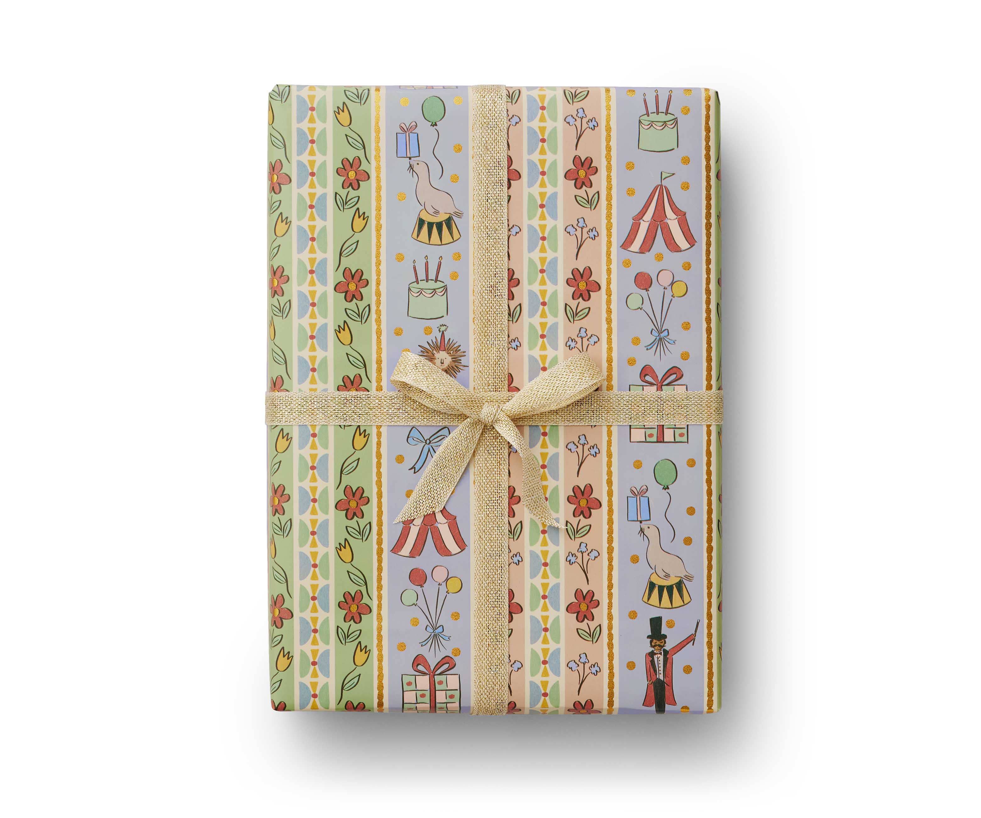 Dress up presents and projects with this wrapping roll, which features eight feet of paper with colorful illustrations, gold foil accents, and gridlines on the back.