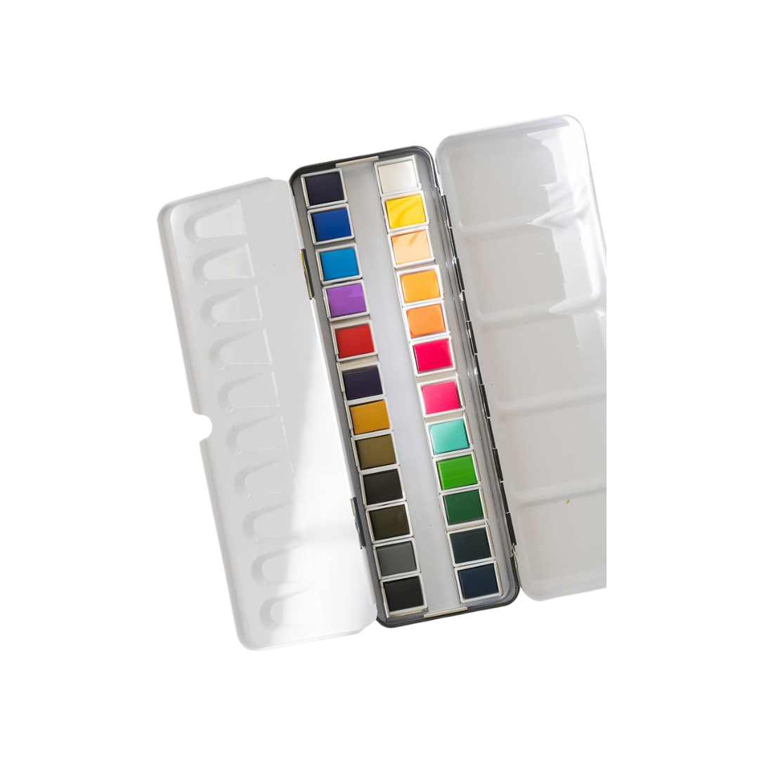 Packaging — paint set comes in a lightweight metal tin. Lid has 3 partitions and used as a mixing palette for easy blending of watercolors. includes a water brush.