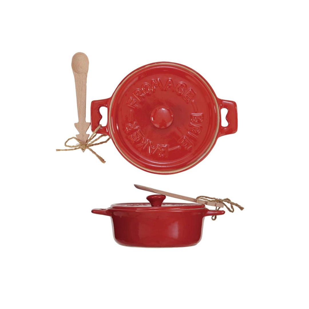 A beautiful and festive stoneware brie baker with a wood tree shaped spoon, a reactive glaze, and a red color. Perfect for baking and serving cheese, dips, or appetizers in style. The brie baker comes with a matching lid and a wood spoon that has a cute tree shape at the end.