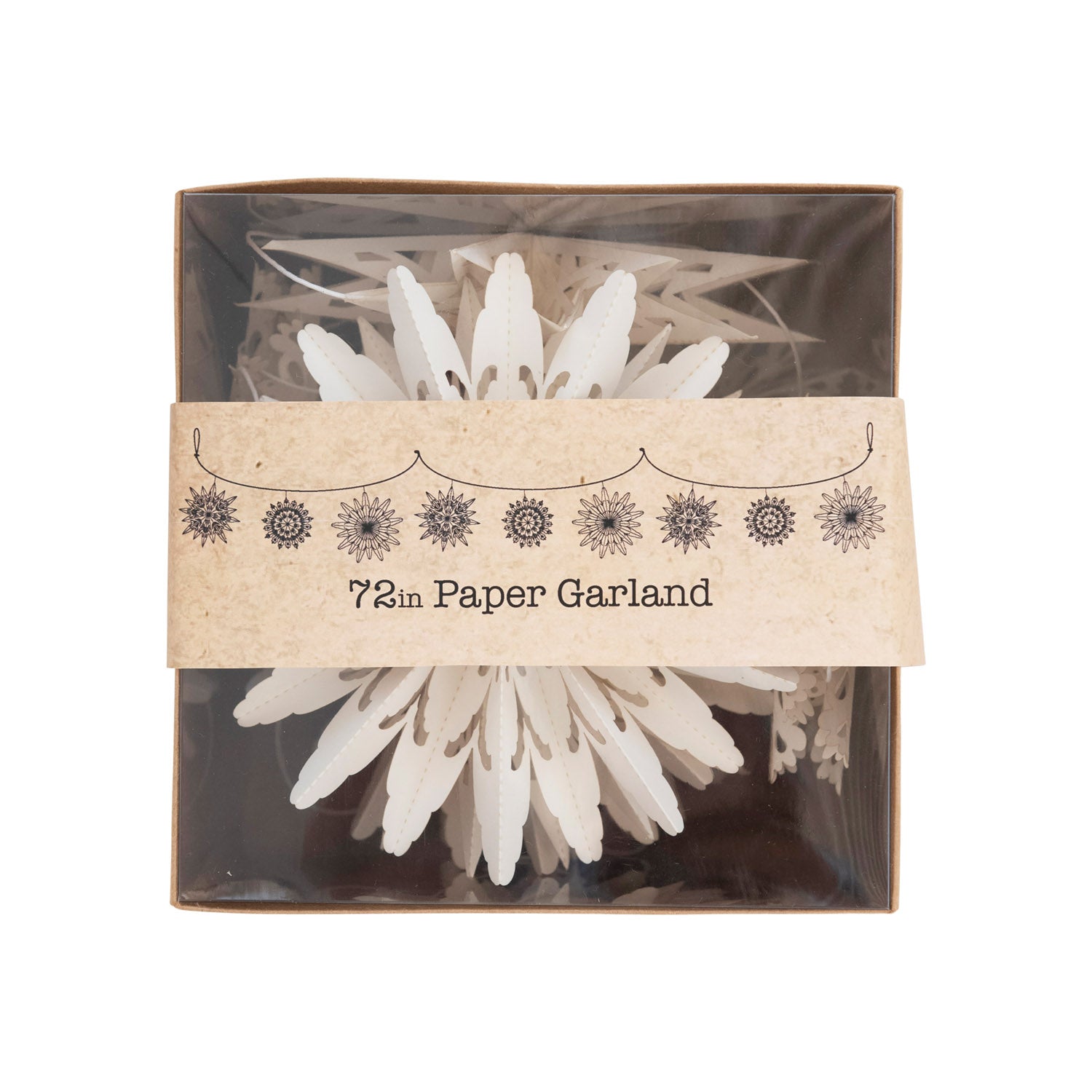 White snowflake garland in kraft box; Add to a seasonal display for a dash of whimsical holiday charm.