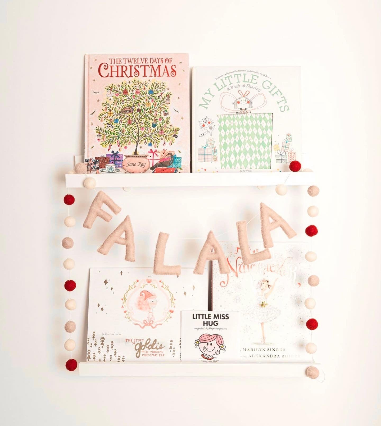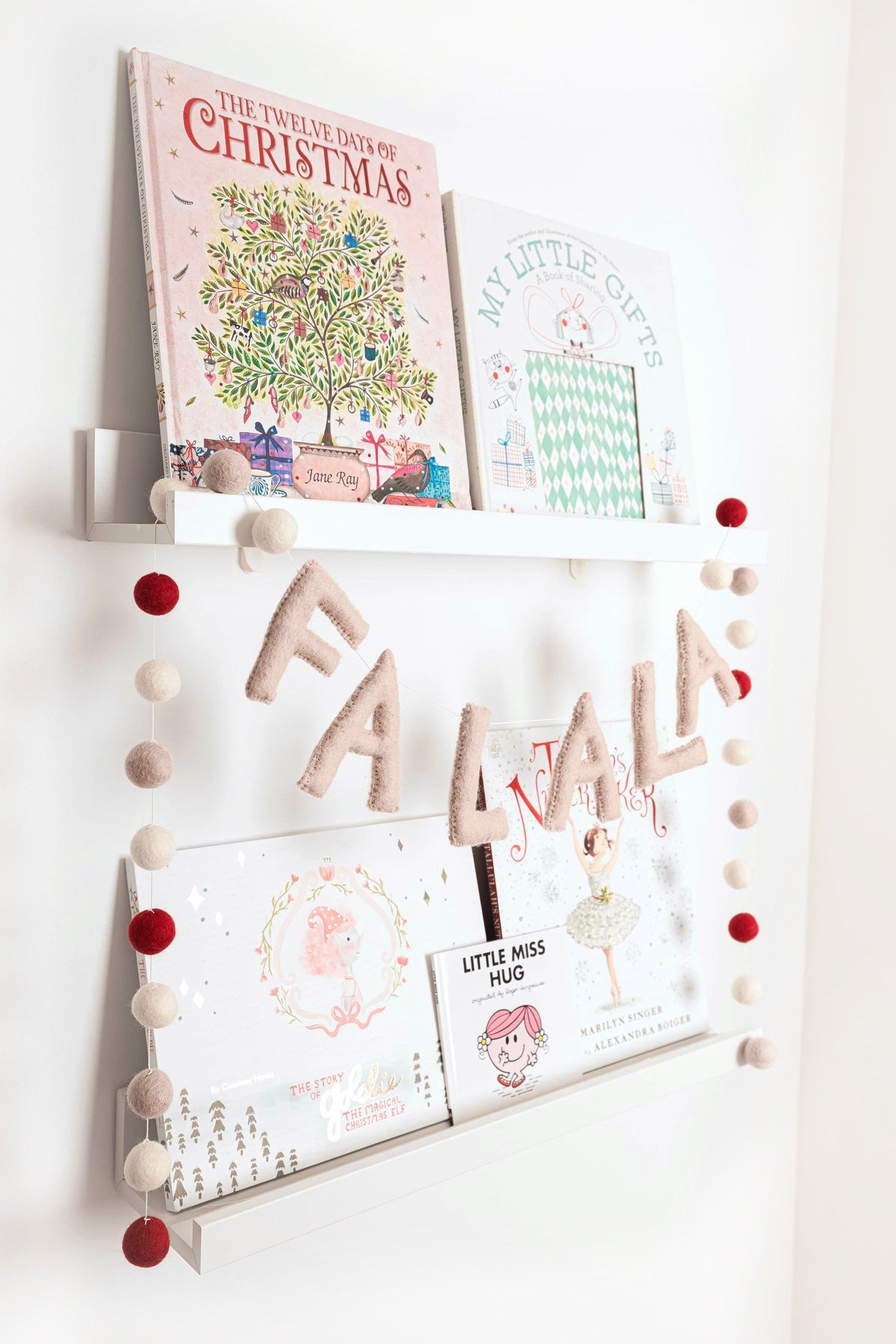 This Christmas garland features pink FALALA between white, pink and red felt balls. The  garlands to be longer in length so they can fit across shelves, doorways, staircases, tables and more!