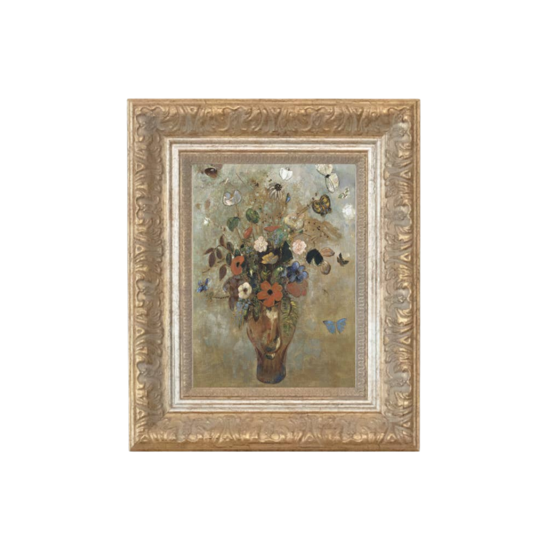 Flower Butterfly Vase framed antique art is printed on quality canvas, giving it a lasting finish, then placed into our handcrafted Copper Gold frame. This is an authentic reproduction of the original artwork.