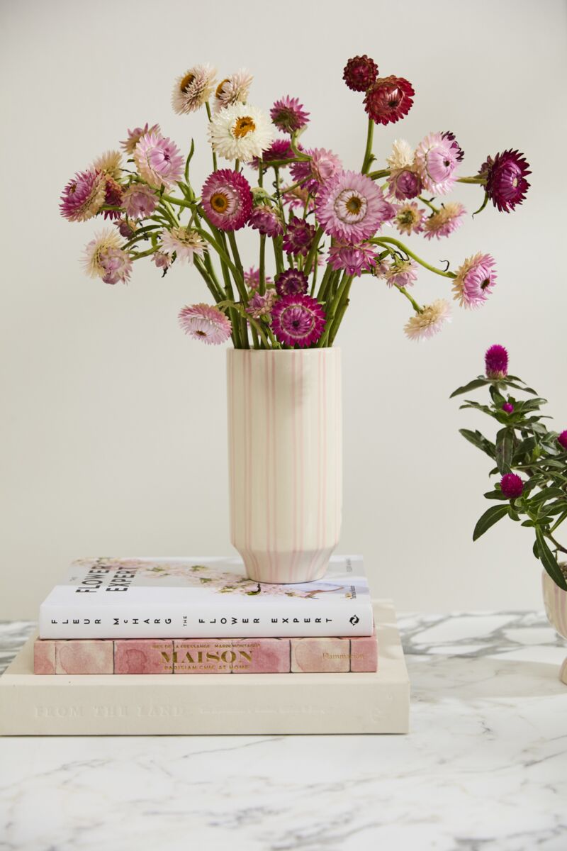 The ceramic cylinder Robbi Vase brings dimension & a bit of color to a centerpiece. Featuring a watercolor hand painted application of imperfect peach double line stripes from top to tapered bottom, this beautiful vessel makes a lovely gift paired with a floral arrangement.