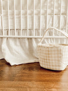 Charming storage....our little basket is perfect for gifting as well as storing nursery essentials, small toys, or attach our matching Baldwin Bear or Bunny Rabbit ornament for a unique Easter Basket! Neutral tan gingham and pin dot liner, this caddy coordinates with our nursery collection. Perfect for monogramming.