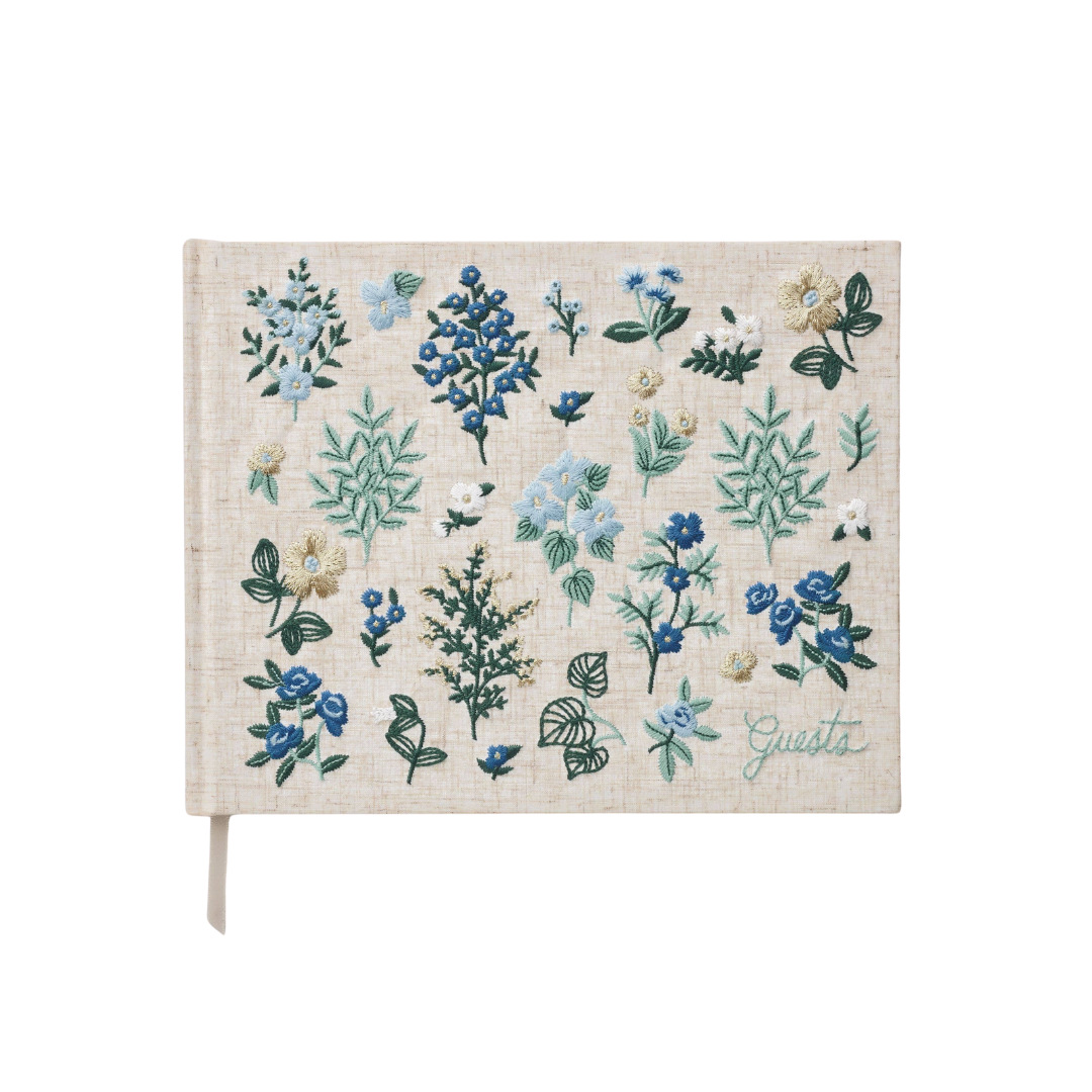 The cover is wrapped in book cloth and embroidered with our blue Wildwood florals and metallic gold accents, and a grosgrain ribbon bookmark will save your place. The perfect “something blue” for weddings, events, and guest rooms alike.