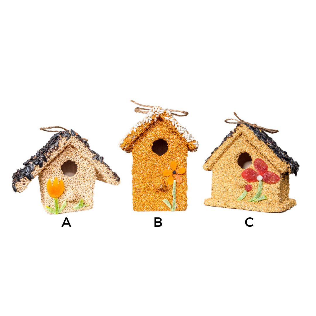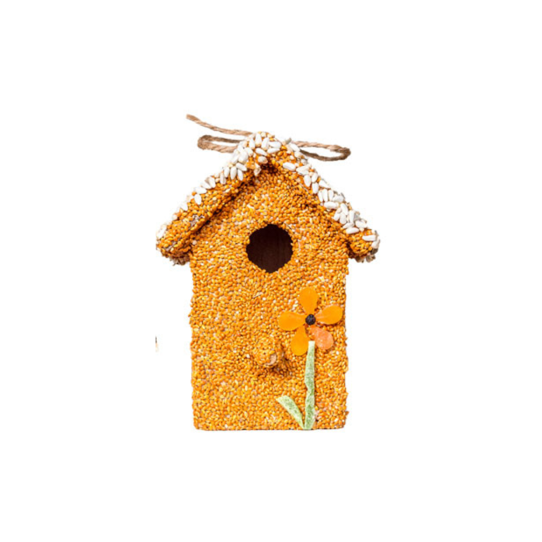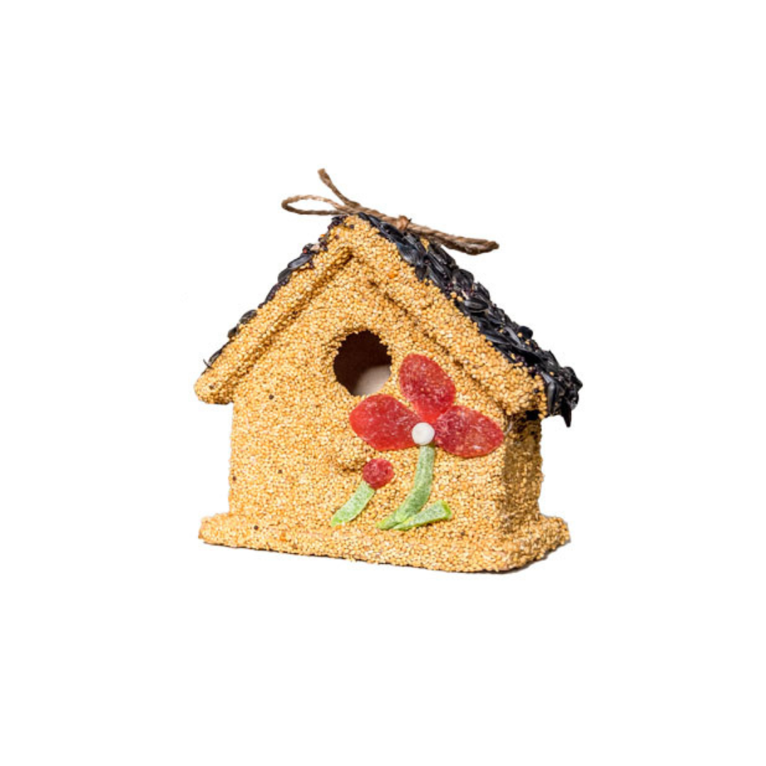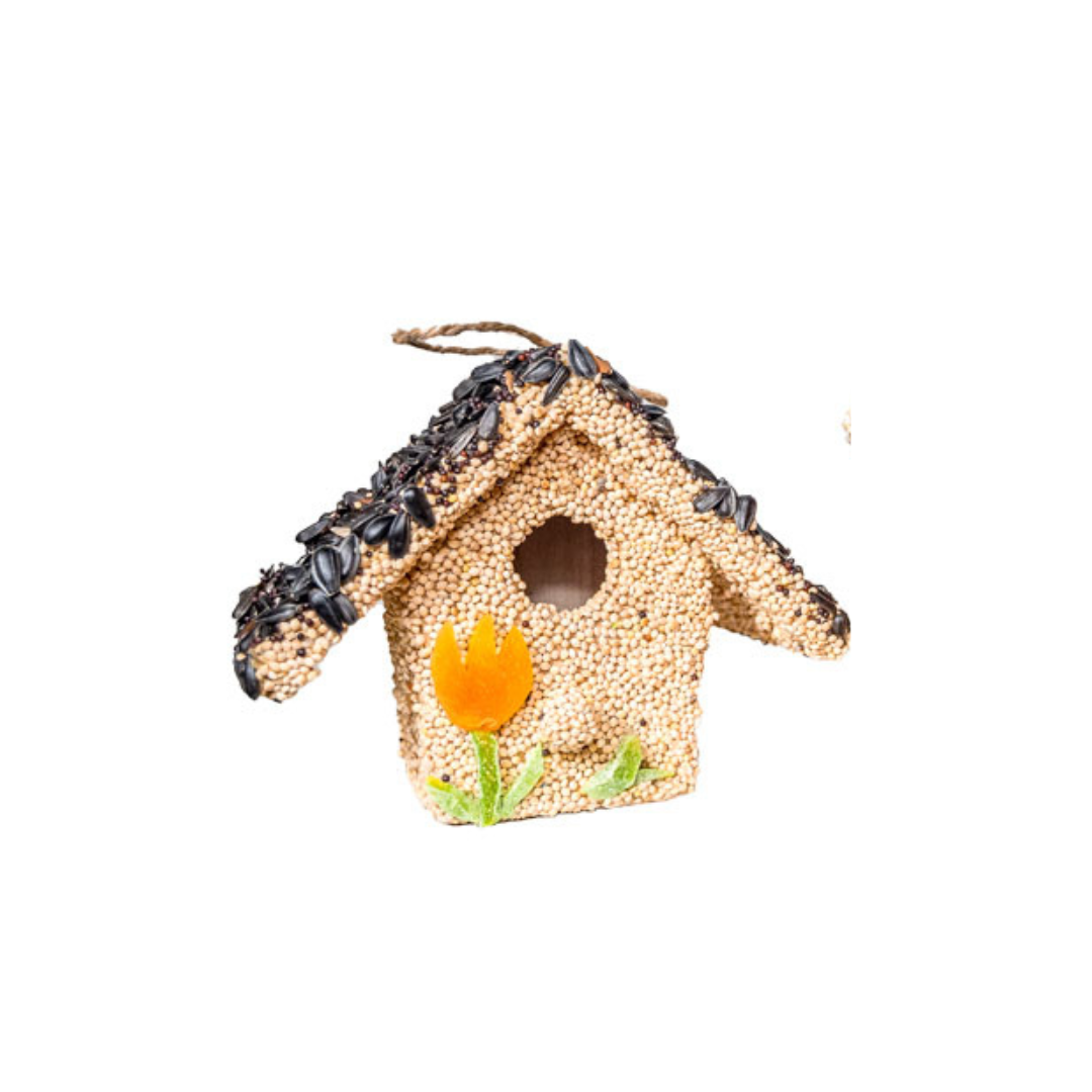 Under the seed and decoration is a small ornamental wooden bird house.