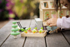 Wanting an extension for your dolls house? For children who love nature and playing in the garden, this set is ideal for encouraging green fingers. A traditional plywood greenhouse with base has an opening door, and 2 removable roof panels. It can be filled with 2 seed trays, a planting bench, 4 pot plants, and 3 tomato shrubs. We have included a cold frame for nurturing seeds, a raised bed with 9 vegetables, a compost bin, a lawnmower, a watering can, a topiary tree, a wheelbarrow, and last but not least, a deck chair for your dolls to enjoy the fruits of their labor.