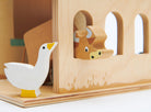 Made throughout from top quality plywood, this farm has been designed to be open and accessible for little hands. It features a barn with barn doors and a feeding trough, 2 stables with opening doors, a ladder leading to hay loft, a pulley system with a magnetic end to lift the hay bales, a cowshed with feeding compartments, four fences, a stile, three hay bales, 2 geese, 2 horses, a grain trough, an animal feeding trough, a beehive and 6 logs.