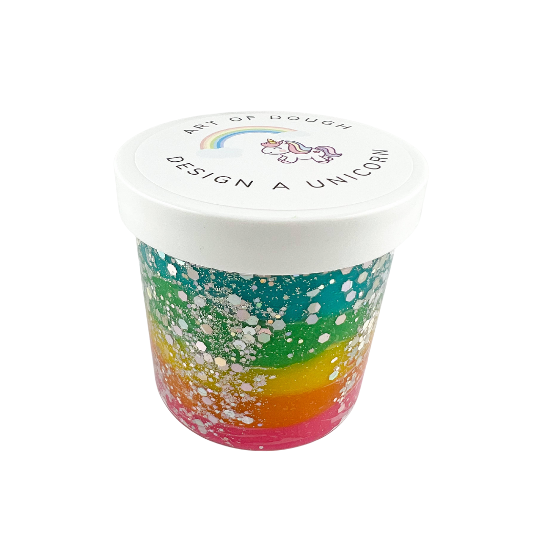- 3oz of homemade sensory dough in rainbow colors with glitter