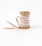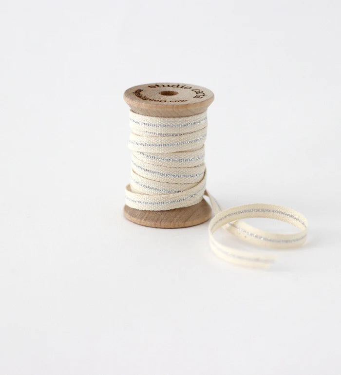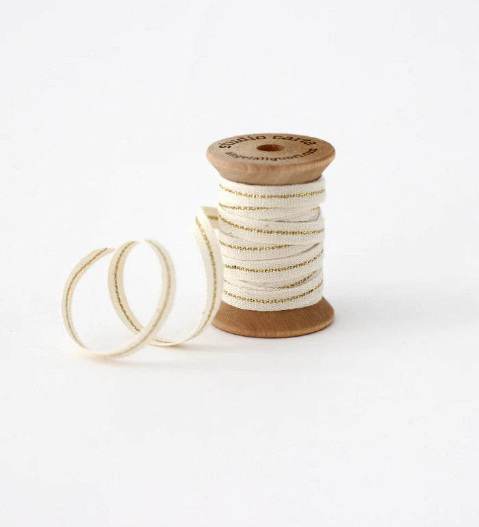 Tight weave cotton ribbon, woven with a delicate thread of gold, silver and copper line.