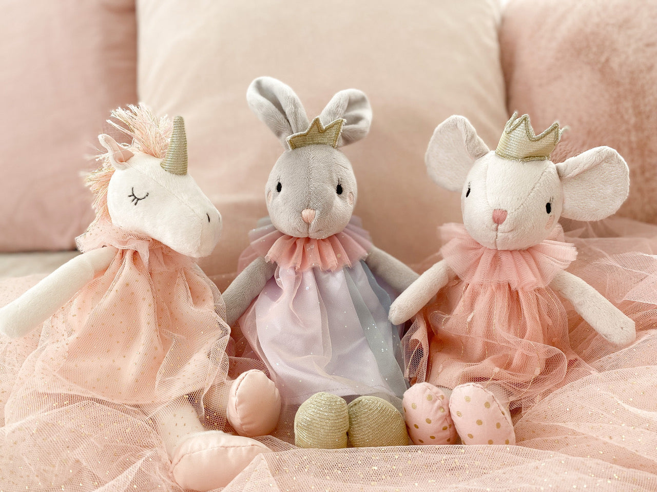 Glitter Unicorn is crafted from beautiful, soft velour and wears a pink irridescent tulle gown. With her gold glittery unicorn tusk, she is ready to travel to the world of imagination!