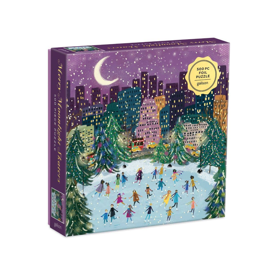 The Merry Moonlight Skaters 500 Piece Foil Puzzle from Galison features a festive city scene with ice skaters, skyscrapers, and snow. The shimmery lights of the city come alive with shiny gold foil accents. Galison puzzles are packaged in matte-finish sturdy boxes, perfect for gifting, reuse, and storage.