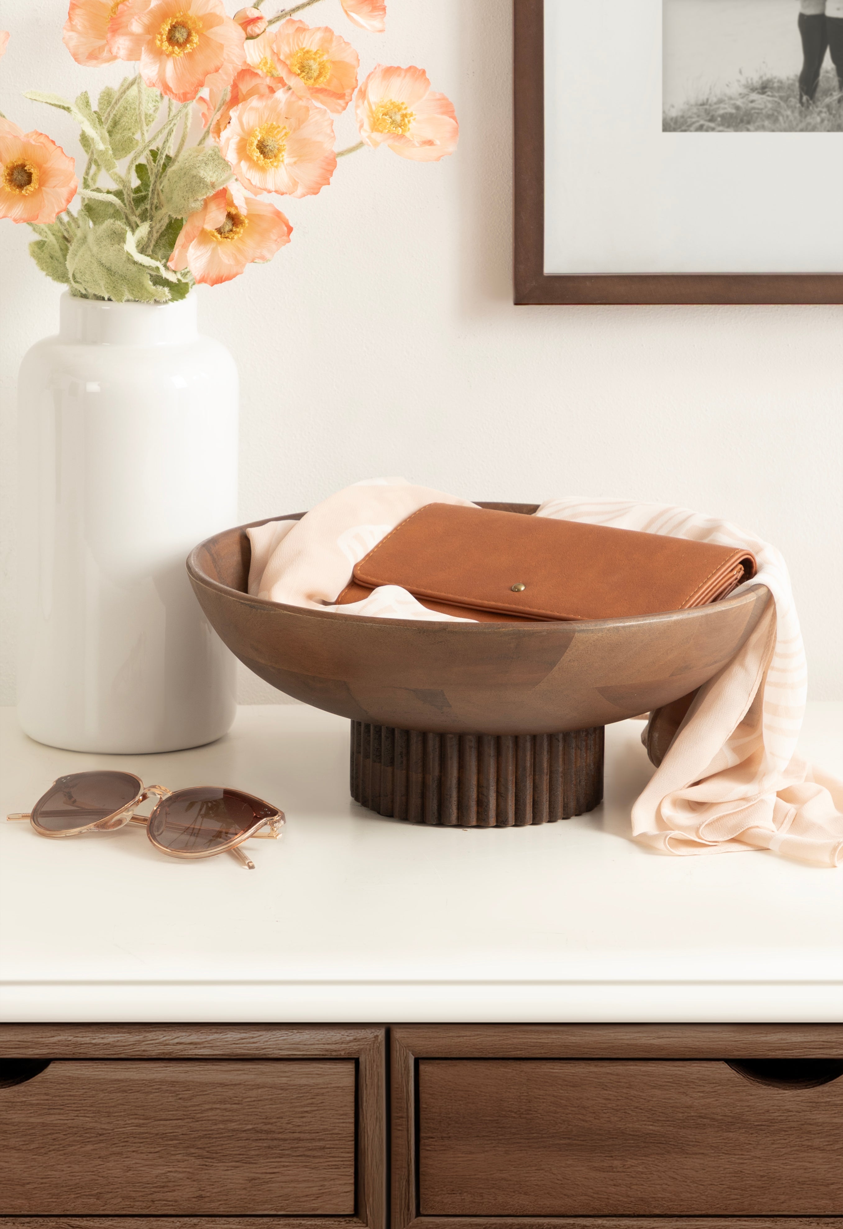 Transform your living space into a sanctuary of contemporary elegance with the Kate and Laurel Rooks decorative bowl. Its wooden ribbed base adds depth and character, elevating the aesthetic appeal of your home decor. Whether showcased on your kitchen counter as a sophisticated fruit bowl or positioned on an entryway table to stylishly hold keys and essentials, this food-safe bowl's versatility knows no bounds. The raised structure not only enhances its visual allure but also offers a practical solution for organizing everyday items with ease. Embrace the perfect blend of form and function as you indulge in the timeless sophistication of this kitchen counter bowl.