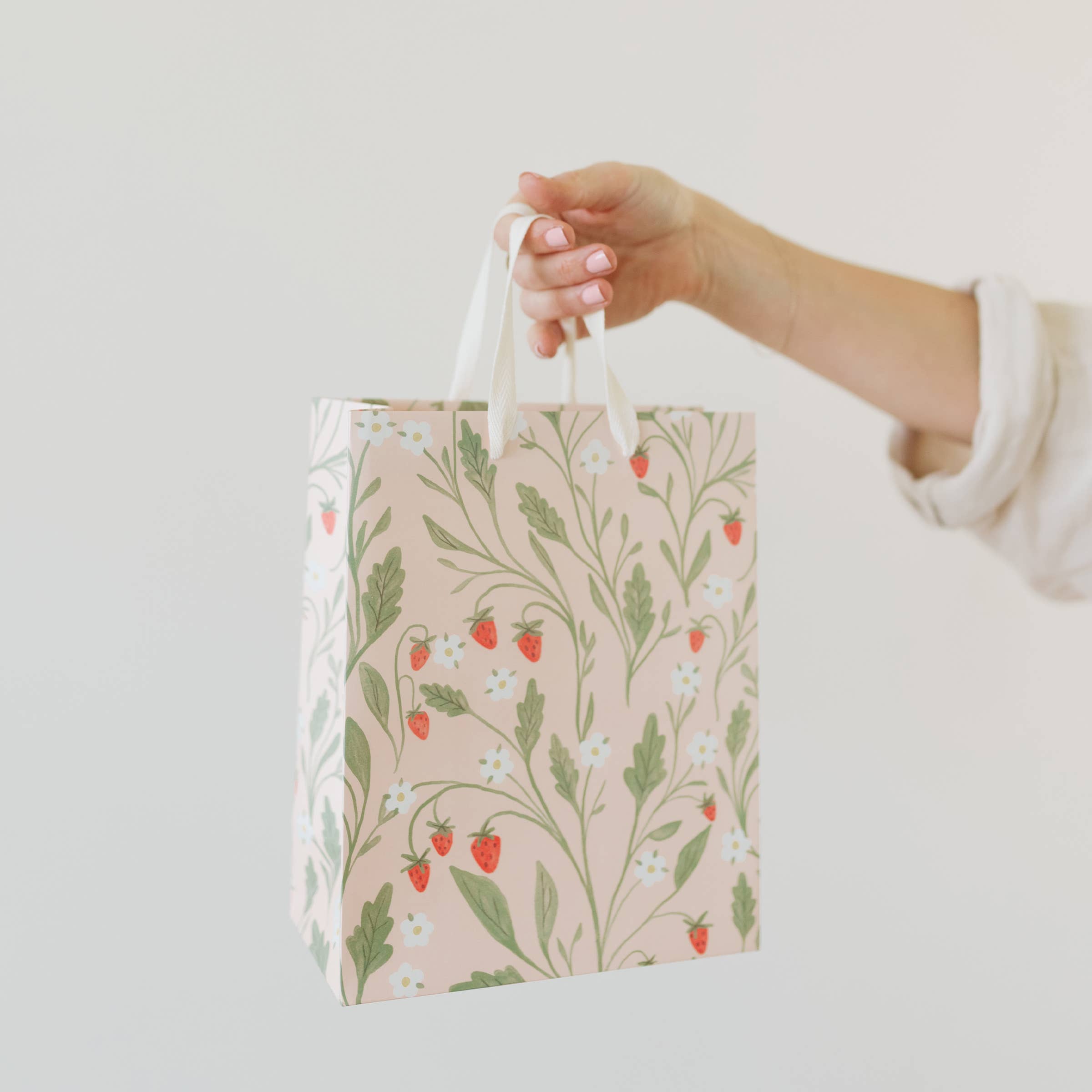 Wrap your gift in something as sweet as the sentiment. This gift bag features a charming strawberry and floral pattern in soft pink, red, and green tones, finished with soft cotton handles for an elevated, tactile touch.